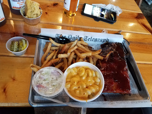 I ordered the 1/2 slab rib dinner with 2 sides, a coleslaw and a 3 cheese macaroni and cheese to go. The ribs were picture perfect. I loved the sweet barbeque sauce that glazed the top of the ribs. Because the ribs are smoked, they are not fall off the bone but they were certainly tender and meaty. Be aware that the 3 cheese mac and cheese is SPICY! The menu should alert customers to that. I fear that adults will order the side dish for children and the child is not going to eat it because it is so spicy. Both my husband and I could not eat it because it was too spicy for us. The workers really hustled to get the orders out. It did take about 20 minutes to pull my order together so be prepared to wait. Prices are average for a barbeque restaurant. I will return to this restaurant.