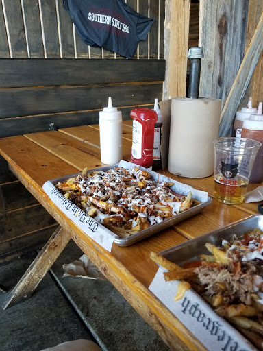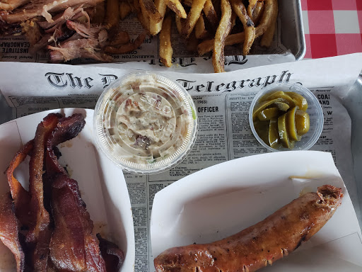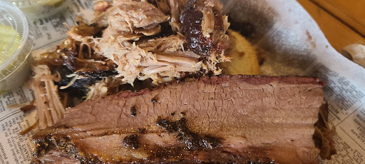 food: brisket poorly trimmed but tasty and tender. chicken and pork meat unedibly dry, but extensive fat in pork - gross. dog was able to choke it down - garbage. slaw with vinegar saturation causing choking - garbage. sweet potato fries disgustingly undercooked - garbage. canned cheese? - garbage. cajun fries salty beyond belief - garbage. i feel robbed of nearly $100 spent here today. dining room: poor ventilation: walked into an inescapable cloud of thick smoke - gag, cough. dirty and grimy, like the public bathroom where youre not gonna touch anything. unfriendly staff: every kitchen person gawking but not one greeting (including from the owner) and no thank you or have a good day, you know, basic level I customer service. i see in reading other reviews (which i am astounded by the 4.5 avg) many similar problems / critiques so in 2 years this establishment has improved not at all. while Matt / staff seems to believe "based on many positive reviews we are doing a great job", they are clearly not interested in addressing the shortcomings, only basking in the self-perceived glow of good reviews, which i can only surmise they write themselves. will not be sad OR surprised to see this business fail.
