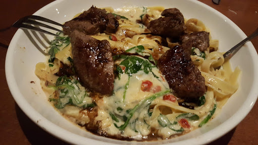 Usually I love Olive Garden, but this one is just not good. The food isnt up to the standards of other locations, and the service is slow and awkward. Hubby and I just ordered a couple appetizers and flatbreads because we both plan on killing a pumpkin cheesecake. After waiting at least 10 min my flat bread comes out before the aps. We just went with it and split mine and waiting for everything else. Then 10 min later the two aps came out. About 5 min after that and hubbys flatbread cane out. While all this is going on, there are 3 tables around us have paid and left but sat there still with all the dirty dishes until our dessert came. Only then did they start cleaning. And I had passed at least 5 servers joking and hanging out by the bar when I went to use the restroom. I recommend somewhere else. Despite the fact our server was sweet, it couldnt save the experience.