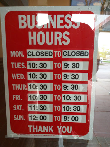 | Working: | 10:30AM–9:30PM 10:30AM–9:30PM 10:30AM–9:30PM 10:30AM–9:30PM 10:30AM–10:30PM 11:30AM–10:30PM 12–9PM |
