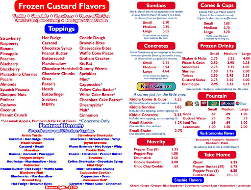 Great custard and the people that work there are great. Remember they are college kids so tip well.