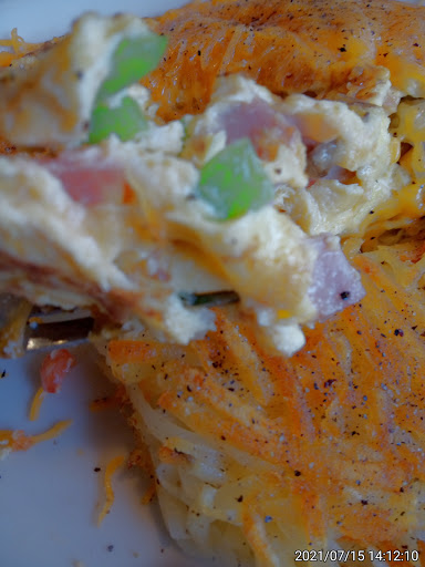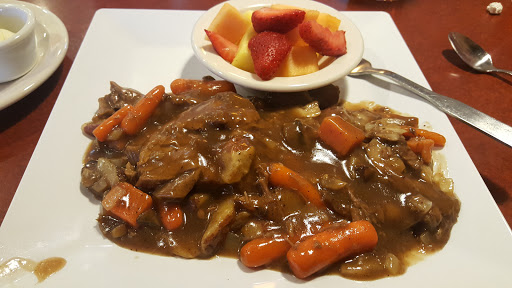 I was just here for breakfast. Coffee is so weak, its like drinking flavored water. I ordered the basic 4 scrambled eggs, two slices of bacon, fruit, and english muffin. The eggs looked like they were pre-made, the fruit was dry, the bacon was cold and also pre-made. The bill was 24.00. My husband had the black forest pancakes, they were not good either.