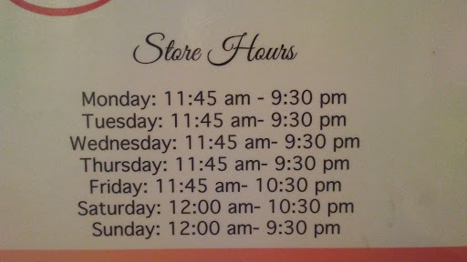 | Working: | 11:30AM–9:30PM 11:30AM–9:30PM 11:30AM–9:30PM 11:30AM–9:30PM 11:30AM–10:30PM 12–10:30PM 12–10:30PM |