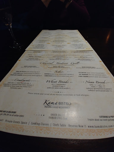 Awesome fusion Indian food! One the best garlic naans. The achari dishes are superb, actually there isnt anything that i dont like from their menu. This is hands down the best Indian place in the burbs and prob the city. Im indian and i love indian food and so far Kama Bistro stands tall above everything i have tried. I love talking to the owners of this place, they are both super friendly and Vikrams wife very good with providing suggestion on what perfect wine to get with the meal.