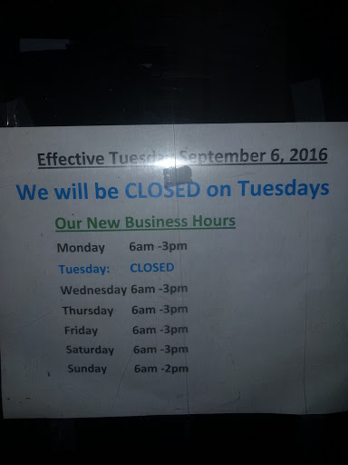 | Working: | 6AM–3PM Closed 6AM–3PM 6AM–3PM 6AM–3PM 6AM–3PM 6AM–2PM |