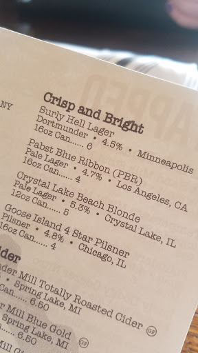 Technically, Id say this joint is 4.5 stars, but Ill round up and give them the benefit. The Lake Zurich area needs more places like this. They have a solid array of beers, and the food was well-prepared but not really gourmet, which was fine by me. Not a wide menu selection but thats apparently by design, so they can focus on their beers. Worth a visit.