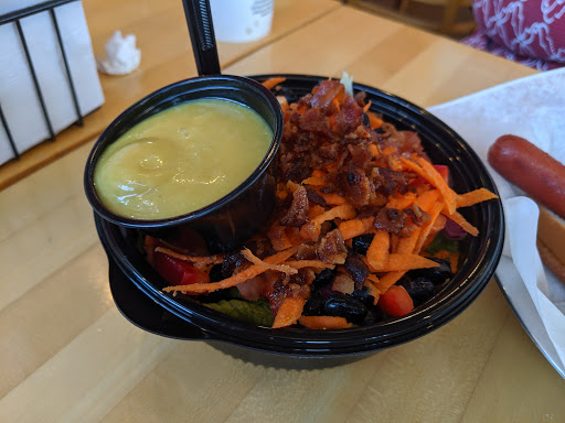 A nice place to get a bite, eat in or take out, the food is good, if youre into burgers and hot dogs. The fresh cut fries are awesome and you get a good size with your order, Id consider charging little less though or having more than one size... its good, but... potatoes are cheap, spend 40 cents dont charge almost 3 dollars... A Texas ranch burger with fries, over $10 and if u add a drink... few more dollars... so: good decent food, not cheap for a burger or hot dogs, nice place with parking available. If youre in the area, its ok, convenient