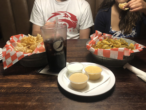 I have to agree with previous posts, the quality of food has declined here since the opening. We sat in a booth in the bar the other night and the service was good, even though our favorite bartender/server, Lisa, was not there. My husband had the barbecue nachos, as usual, and thought they were good. I usually order a barbecue burger (not nearly as good as it used to be) or ribs. That night I was nursing some dental work, so I ordered the fried okra appetizer and the barbecue baked potato, neither of which Id had before. The okra was a total surprise -- seemed to be fresh, not frozen, and lightly floured, rather than the commercially prepared with a thick crust of breading. The okra arrived hot and was very good and I could have eaten three orders of it and called it dinner!! The baked potato, on the other hand, was actually salt-covered and baked (not nuked) but was disappointly lukewarm. It was supposed to be topped with bacon bits, green onions, barbecue and cheddar cheese. The cheese was not hot and the barbecue was very skimpy -- like maybe a tablespoon or two. This potato was $3 more than their regular baked potato with butter and sour cream, but I did not have $3 worth of topping ingredients. The other elements of our dinner experience were also mixed. We ordered unsweet tea, but were served sweet. We also ordered the banana pudding which comes layered in a jar with thick slices of bananas, whole vanilla wafers, pudding and (not real) whipped cream. It was cold and yummy and a generous serving for two. Next time we will go to the Murphysboro location.