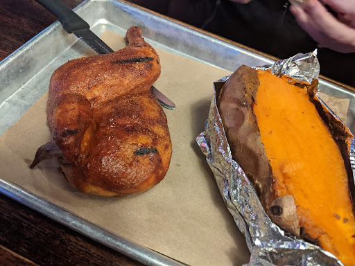 I had the signature menu item- pork ribs. $18 for 1/2 rack with two sides. The rib meat was not very tender and certainly not fall-off-the-bone. The flavor was OK, not spectacular, just OK. The rib bones were larger than the portion of meat between them. In other words, not a lot of meat. I was happy I only ordered half a rack. The original sauce is mustard based and quite watery. And not very flavorful. No other choices. Had the fried okra (very tasty with a thin breading and a large portion) and baked beans (very good flavor but were served in a very small portion). Come on, theyre baked beans, cant I have a reasonable amount?? I had a house-brew beer and it was tasty and affordable. I think theyre riding on their reputation from winning a rib competition in the early 90s. Would I go here again? Probably not. It wasnt bad, just not that good.