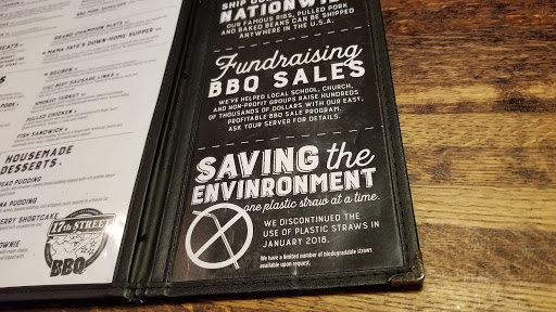This place is usually pretty good. Ive quit ordering steaks there though, because they are incorrectly cooked more frequently than Id like. Yes, theyll cook another one, but that means my wife and I have to play the "Ill watch you eat, then you watch me eat" game. I usually order the pork shoulder (full pound) for $16, which is a pretty good deal because it comes with two sides and Ill get one to two more meals out of the leftovers. Im not a big fan of the ribs. Theyre not terrible, but I ordered them once and not again. The bread pudding is excellent with a scoop of ice cream, though its nothing like grandmas. To summarize, 17th Street is on our list of regular haunts but we have a few other restaurants that we go to twice or three times as frequently.