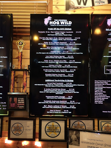 I lived in Chicago up until the age of about 11, and I cant recall even hearing about this place; not once! We didnt live all that far from Midlothian ~ Bolingbrook. I know I wasnt having that vague "familiarity" with the name, "Hog Wild," from a childhood experience. Where was it coming from? It finally dawned on me, I had seen this place on more than a few restaurant / cooking shows on the Food Network. It all rushed back to me at once. Myself, and the two others I was with, were forced to drop what we were doing, and head-out to Midlothian. We arrived maybe 30 mins. after the place opened, so there werent many there. I was compelled to take pictures out front, and of the "Cabin in the Woods" toasty atmosphere once inside. I ordered a full slab of their famous baby-back-pork ribs. I remember going to fill our drinks up at the machine and by the time I got back to the table all the food had already been there. I dont want to put any "bad juju" on the place by praising it to death - But... That meal was in my Top-3 Best Meals So Far In Life. True Bliss. Dont change a thing.