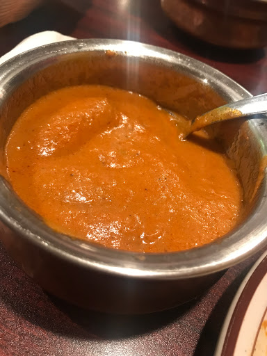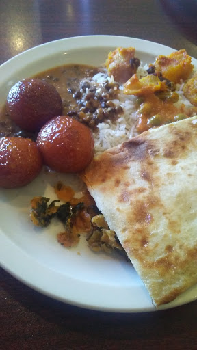 From the outside the place doesnt look open and a little run down. The inside isnt fancy but offers a nice place for a group to gather and get a great meal. It has a small lunch buffet with 2 types of soup, a salad bar, nice selection of several main course dishes, and 2 choices for dessert. All you can eat for $8.99. I also noticed that they have a special one night during the week for $8.99. The soups looked interesting and the one I tried was tasty. The Sambhar was hot, spicy, and delicious. Matched with a piece of Naan bread makes for a good meal or starter. Each item of main course was kept hot enough that it was steaming when brought to the table. The choices included some spicy dishes along with not spicy items. All that I tried were very flavorful. The desserts were a little unusual. Neither were sweet and not what I expected.