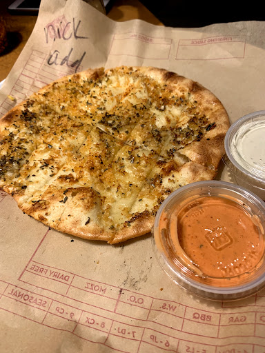 Ordered online. Showed up at the store at the time the website said it would be ready. The employee at the cash register told me it was in the oven and they would call my name when it was ready. Half an hour later I asked to speak to a manager and was directed to a "captain" who told me my pizzas had been sitting there waiting. No one ever called my name. The pies are good and members of my family are Gluten and Dairy free which MOD can accommodate. Just do yourself a favor and dont order via the internet.