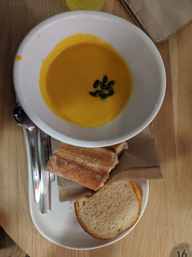 I stopped by this Panera after a weekend run and was a little disappointed. From their "pick 2" menu I ordered a Mediterranean veggie sandwich with a bowl of soup. The food was tasty, however, for $8 you dont get much. The sandwich is the size of a one cup measuring cup and so is the soup. If youre really hungry, like I was, expect small portions at a high price. Chipotle or subway might be a better option imo. More food for the price and non gmo. However I will hand it to Panera for the pleasant dining experience and free wifi.