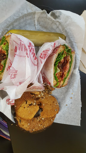 3.75 stars. Drill an extra hole in that belt buckle and bring your big boy/girl hands to hold these epicly large sandwiches. Youll either leave with leftovers or wish you had an extra stomach. The prices seem a little high but the food is good and your kids can eat free depending on what you order. Try the Schmacon on a bagel sandwich - its not quite bacon but its darn good.
