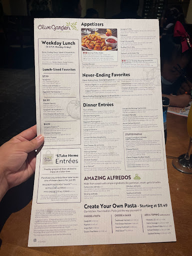 At this OG you always walk in & have to wait even when its not crowded for 10 minutes. Then you have one server for a section of too many people. Then by the time you get your order in, and get your soup or salad, theres been numerous times where the breadsticks arent ready. How can your trademark not be ready at all times? Then also this OG is just cheap. Beverages arent filled all the way, soup is filled only halfway up the bowl, you only get like 3 breadsticks for 2-3 people, the spaghetti you get like barely any noodles to the point you can eat it in 5 minutes. Oh and I forgot to mention that if you dont tell them to hold your food, they have numerous times brought it like a minute after you get your soup and salad (with no breadsticks). Theres been a few times we didnt get the mints at the end either. Like Im a nice & open minded person so it takes a lot to make me give one star but I truly think this one is one of the worst OGs in IL. You can get better service & more food at other OGs.