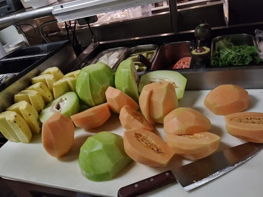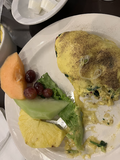 Fresh fruit all year! Service was good steady refills food was fast and very good. Slightly pricy for breakfast food but everyone was impressed and there was no wait at the odd time of day