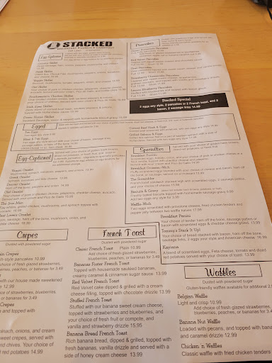 I ordered a side of french toast, and 1 meal with french toast, eggs and hash brown. The waitress didnt explain that the french toast came with about 6 slices of french toast. I would have never ordered the extra side of french toast had she given me the courtesy of explaining how the french toast came in a side order. Usually I pay $10 and some change for 1 order of french toast, eggs and sausage, but for the added side of french toast, my bill hiked to $29.18. These people are hungry for money and will overcharge you if you let them. Theres plenty other restaurants that are better than Stacked. I dont mind paying $29.18 for breakfast when it make sense, but my charges were over what I should have paid. The lady refused to correct it.