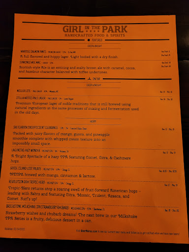 If youre looking for an enjoyable whiskey bar, avoid Girl in the Park. Up charges for neat pours are bush league in general, but particularly for an establishment that puts so much emphasis on its whiskey. The fact that they do not tell you about the charge, and that it seems to be a ridiculous 25% of the cost of the drink you order, is absurd. If you self-identify as a whiskey bar, and whiskey is one of the core things you do, you dont get to up charge for the simple courtesy of doing it right. And Ill just throw in, maybe get the right glassware for it, and try not to give out the semi-warm, fresh-from-the-dishwasher glasses. They also advertise their cocktails, but I wouldnt look to those for a respite either. For $10-12 they arent exactly overpriced as far as cocktails go, but the attractive and unique menu selection belies the watered down and largely tasteless drinks that will actually show up at your table. I will say the beer selection is good and well priced, though, so youre not totally adrift at sea without a life preserver. The food is pretty hit-or-miss too. We got the beer bacon cheese dip and the buffalo chicken dip for appetizers, and both were excellent; the beer dip in particular, with nice solid pieces of bacon in it giving it a nice smokey flavor. For dinner I ordered The Girls Signature Truffle Burger, which was a mixed bag; the toppings were well constructed and flavorful, but the burger I had ordered to be medium came back well done, and the vaunted truffle tots were indistinguishable from the regular tots others at the table received. The decor is a little all over the place too. On one hand you have a nice mix of wood-heavy elements like the bar and parts of the walls, which try to lean in to the hipper design elements of the farm-to-table and craft cocktail trend, and on the other hand you have an omnipresent shade of green all over the place that makes the place look like a dressed up Quaker Steak & Lube. We also found the inside to be far too noisy and difficult to hear the people you were sitting with. The outdoor patio is beautiful and very dog friendly, though, so aim for that in the summer months. To summarize, when you walk up to the restaurant youll see three things plastered all around the building: Beer. Burgers, & Bourbon. Ill give them the beer part.