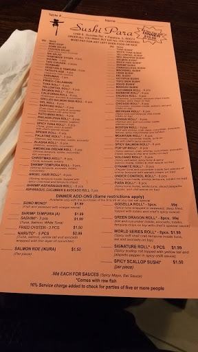 This is, by far, my favorite restaurant anywhere. Let me cover every aspect, as Sushi Para deserves a verbose review: -Food- People may at times tell you that the best sushi is single-plating versus all-you-can-eat. That isnt the case here. Sushi Para chefs prepare the sushi extravagantly and neatly, quickly, and plump. The eel is perfectly moist, tender, and is absolutely my favorite thing there. Ive had eel other places and its either been dry or overly salted. Not the case here. The tuna and salmon are exactly the right color and temperature for the most flavor. Im personally not a fan of fish roe, but its absolutely beautiful, the quality of the roe. The appetizers are always freshly prepared and cooked. The edamame is perfectly spiced/salted and the beer/beverages are always served frosty. I never even bothered to ask about dessert, mostly because every time I eat here, Im bursting at the seams. -Service- The staff is exceptionally friendly. Mind you, Ive been to Sushi Para II in Chicago and the service there is attrocious, but no surprise to learn that the original is always the best. The ladies are extremely courteous, always smiling, and never rude to any extent. The chefs/preparers make conversation amongst themselves, but never uncomfortably or unprofessionally. The last time I tipped them (not just the waitress), they all stopped for a moment to thank me. I had to remind them that they do an amazing job and Im the thankful one. The manager there is very friendly, always on the move, and sacrifices her own sanity to maintain an excellent sense of professionalism and quality. This is the kind of place I enjoy overtipping, because its never a disappointment. Ever. Plates and beverages are brought out quickly, though understandably, preparation takes a bit. My recommendation? Order edamame or tempura while you wait. Its worth it, trust me. And all well worth the price. -Maintenance- Tables are always cleaned and wiped down, silverware (if requested) and plates/glasses are always spotless, and floors are cleaned during slow times. Even when the place is packed, it maintains a very professional sense of cleanliness. My only complaint is that the chairs are somewhat rickety, but thats not really an issue and not worth delving into. -Price- Who can argue with a $20 dinner and $15 lunch, both all-you-can-eat?? And when the food is worthy of 3 times that price? Its perfectly worth it! Id go more often than I do, but as I said, I love to overtip here and have tip for the chefs. Overall: If you live in the city and are a good distance away, you should still make the trip. Given that Sushi Para II and Sushi Para M are in the city, their customer services are horrible. This place is worth the trip, believe me. First time sushi eater? Make this place your first time and youll be coming back for more, guaranteed. Recommendations: I very highly recommend trying Eel sushi (not the rolls, just the regular sushi). The sound of it may be intimidating, but you will NOT regret it! Also, although its a premium item (slight extra cost), you should try the Godzilla rolls. Its orgasmic and filling. Edamame is an absolute must. Remember: only eat the beans, not the casing lol 5/5 all the way