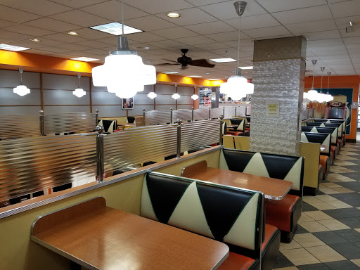 Retro look and large. Always fresh food. Cashier was very helpful. Booths were very worn, could use some attention.