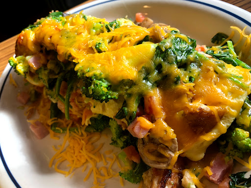 Breakfast all day always a plus. Service great. Waitress friendly and willing to provide extra items. Good family friendly atmosphere. Kids & senior (55+) menus. Special senior 3pm-5pm offer -BOGO. Food served at good temp. View of Higgins Rd, mature trees on property offer shade in parking lot.