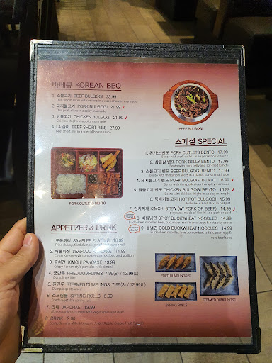 Amazing Korean cuisine at very reasonable prices. The menu is small and focuses on sizzling BBQ meat plates, cold noodle dishes and soondobu. Get the hot place or stone rice bowls - its worth it! Absolutely delicious and worth the trip. Service is also prompt and friendly. Everyone there is Korean - a sure sign thats its delicious and authentic!