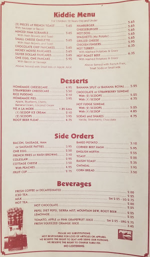Stopped here 1/2 hour before closing (they close at 10PM every day) and ordered three breakfasts. Food was hot, reasonably quick and what youd expect at a diner. Service was good and the food was OK, not spectacular but hey, its a diner! If you are hungry and passing through, stop here for a bite to eat.