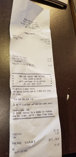 Awesome food, fast service, clean restaurant, plenty of parking, and great drink selection! If youre looking for a healthy bite to eat, this Qdoba is a good option.