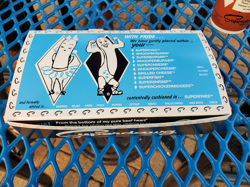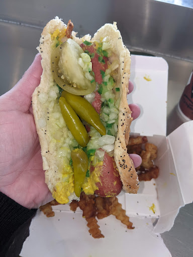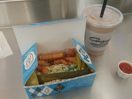 There is no better place in the world to get a hot dog. The place is magical. The hotdog is an excellent quality jumbo kosher dog, the pickled tomato is unique, and the box this beautiful dawg lounges in is iconic. Ive been going to Superdawg for 20 years and have eaten at every hot dog place in the North Shore. Nothing compares to Superdawg in this area. There is a reason why this place was one of the 64 hot dog places featured by Serious Eats in the "The Search for Americas Best Hot Dog" contest. It my opinion, it should have won. Eat the dawg when you get it--the fries will be crisp and delicious. Let them sit in the box like some other fool reviewers did, and yes, they will get soggy. Duh. Their milkshakes are incredible too. And their onion chips. I think I might go there tomorrow, come to think of it!