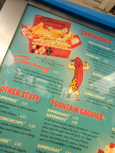 FUN FOR ONE-TIME, BUT PORTILLOS HAS BETTER FOOD AND VALUE My spouse and I tried this place out for the first time, which may have been long overdue considering weve already lived for several years in Wheeling. Now we can say its off our list of the book, "100 Things to Do Before You Die." Sometimes not all of the experiences are great ones or even good ones, but its a fairly memorable one. First its only fair to Superdawg to qualify my review by saying that we are likely not their target market. This would likely be more enjoyable for a family with kids. But on the other end, we try to avoid fast food places that would probably make a good sequel to Morgan Spurlocks "Super Size Me!" On the plus side, the place clearly has a fun exterior and interior design, and everything was very clean. We ordered inside and got a Superdawg, a Supersteak sandwich, two orders of Superveggies, and a chocolate shake. (The sandwiches come with fries and they dont allow for substitutes, which was a disappointment to us.) OUR BETTER EXPERIENCES... Our most pleasant experiences actually turned out to be the side items and condiments. This was the first time I had been served a wedge of green tomato with a sandwich, and I liked it. (It was also one of the few things that hadnt been fried!) Our Superveggies were deep fried, which was no surprise to us, but it was the first time we both had deep-fried battered creamed corn, and it was tasty as well. THE OK EXPEREINCES... My steak sandwich was alright to me, nothing spectacular, and my spouse seemed to enjoy it more than I did. The Superdawg tasted good but nothing spectacular, and was flowing with the artificially-colored green relish. (I love Chicago hot dogs, but thats my one peeve.) THE BIG DISAPPOINTMENTS The fries were mostly overcooked and small, which is probably why they wouldnt allow for substitutes since they appeared to be the easiest thing to fit into the cardboard boxes we were served with our sandwiches. Also the so-called "Supershake" we paid $3.95 plus tax came in just a 12-ounce cup. Seriously, you cant call your fountain beverage "super" if it comes in a size that would pass for the smallest beverage serving anywhere else! Perhaps if we didnt have Portillos around, or even other local-style places right in a half-mile from us, we might give it a better review than 2 stars. But if youre in either Wheeling or Chicago, all I can say is after youve had the one-time experience, you can certainly do better. But hey, after driving past it for years now, we can have the assurance of a memorable experience, and it does look cool on the outside!