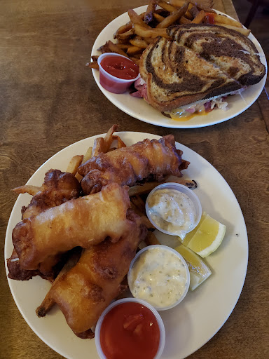 We decided to come here for some dinner during a bike race that was being held right out front, which is here every year. You would think with the event coming here every year at the same time the restaurant would be a bit more prepared. They were out of basically every side including FRENCH FRIES, which was a little annoying. Also there were not enough chairs on the outside balcony for as many tables. They had two privet parties booked that same day and one of the parties had not even shown up yet (wasted un-used space). Now for the food. There was absolutely nothing special about the food. Fish and chips (chips=Mac n cheese because they were out) was bland, Reuben was OK, burger was tried and old, the only good thing about this place is they make the drinks strong! Oh and also beware of the bar stool type chairs they have outside, they are old and rotted from the inside-out.