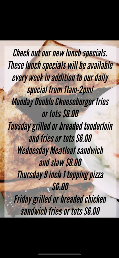 Best burger in town. Hand breaded real tenderloin cuts... The best pizza anywhere. No cover charges, live music, $13.50 domestic buckets of 6 beers every day of the week and $2 domestic Tuesday, free food Monday and Tuesday nights.