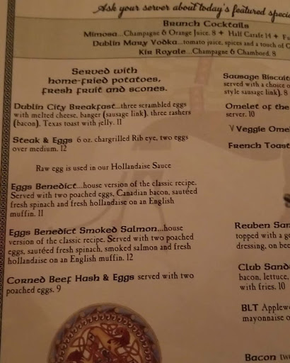 Went here for brunch on Sunday and walked in right when it opened at 11:00 a.m. The restaurant felt authentic, and we were dining with many people from across the pond. There was a large selection of Irish whiskeys and other cocktails. I ordered the Dublin City Breakfast, which was good, but didnt blow me away. Standard scrambled eggs with cheese, white toast, Irish sausage, and a fruit cup that was mostly melons. This place didnt blow me away, but it was solid. Id suggest going somewhere else as there are many better options, such as Tap right next door, but its not usually crowded.