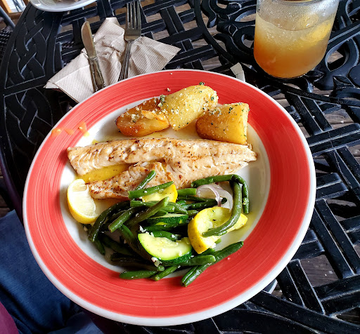 The food, service, and atmosphere were awesome! Superb talapia and prime rib. Great view of lake.