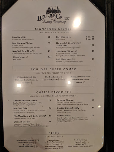 Just a tip for you...... DO NOT ORDER THE FILET! It is about the size of a quarter. We actually laughed when the waiter brought it to the table. You know you are in trouble when the waiter asks you immediately after setting the plate down, would like to talk with a manager. He seemed to agree it was pathetic. Then we ask for manager to take steak away and bring 12 oz New York Strip. We have had this steak and figured this is a safe selection. Well.... what did he do??? He brings a so called larger Filet. Not the NY Strip I requested. This Filet was the size of a silver dollar..... He said this is a 8 oz. I was blown away. Did he listen to my request? Was I unclear? We gave up. NEVER ORDER A STEAK AT BOULDER CREEK without seeing it first. Or go to another restaurant!!! Best choice the latter.