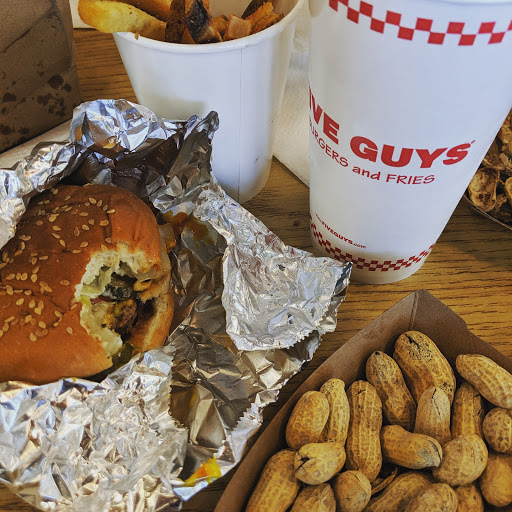 Five guys is five stars! ! The food has always been delicious here. They load your bag with fries so no need to get a family size!! Free peanuts too !!