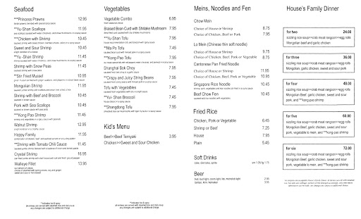 House beef, chicken with sesame seed are some favorites and the very best hot and sour soup, Great food at a local restaurant. Very clean and comfortable atmosphere.