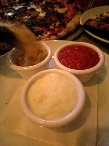Are you a Carmel mom that wants to drink wine with other Carmel moms while hitting on younger men, all while not leaving the comfort of you own neighborhood? Boy do I have the place for you! All joking aside that is the vibe of this place. Overall the restraunt and theme are styled well and definitely inviting. But thats where the troubles start. Firstly let me say our server, Victoria, was amazing and very knowledgeable about everything and beyond pleasent. That being said upon being sat at a table in the bar and left with menus there is no way you can attempt to read with out holding it up to some source of light not provided by the establishment, whether your lucky like myself to have some dim setting sun light left or if like the people set shortly after us who were forced to use a the flashlight on their phones. Its just honestly silliness. After ordering a server passed with a few plates to which I immediately made the comment "God that smells like dirty feet", a half our later our pizzas arrived only to find the "baby cheezus" we had order was in fact the dirty foot smell. I am not exaggerating when I say the pizza reaked. It was so bad I made them box it up so I didnt have to smell it. I couldnt even eat a full piece. That being said the pepperoni piquante pizza was pretty good. You can really taste the quality of the ingredients though it was a bit scorched on the bottom. The breadsticks were very good. And the side car sauces were very interesting in the way you can add it to your pizza to alter the taste, though nothing could over power that stinky foot pizza. Ugh.