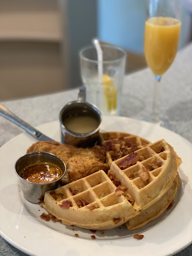 I had the Chicken and Waffles and Peppermint Mocha. The mocha had actual peppermint candy bits in it! Yummy! Chicken and waffles were the best I have ever had! Chicken and bacon infused in the batter with a fried chicken breast on top. The breast is usually smothered in hot Tennessee sause. I opted for it on the side. Friendly staff and clean restaurant.
