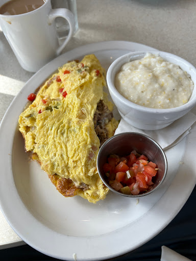 I would have given two stars, but for two things: the intensely flavored smoky chipotle mocha and the grits of the day! Whats good: device was awesome! Staff if kind and patient as well as expedient. The mocha seemed espresso machine made with a nice froth and wonderful flavor. The chipotle spice kicks you right in the taste buds with every sip and the honey and orange zest draw down the harshness of the spice. The grits of the day were cheese grits with turkey sausage. Now, I love grits and grow very tired of watered down, flavorless grits. Wild Eggs does not disappoint! Thicker, cheesy and with chunks of cut up turkey sausage, the grits are full of flavor and savory! Whats not so good: Well...everything else. Eggs are out of a carton for omlettes, not fresh cracked. If they are, theyve added far too much water or milk to them and gives them an overfluffed, rubbery texture lacking flavor. Home fries were prepackaged, similar to Bob Evans and cooked grill top with onions. They were almost powdery inside in some cases, not conveying the texture of real home fried potatoes. Pancakes were ordered just one as a bread. Absolutely. No. Flavor. Just flour and water and egg. No vanilla, no allspice, nothing. Butter, powdered sugar and syrup did not help. And it looked delicious! I felt as though Id been conned! While the asthetics of Wild Eggs is airy, open and bright, its food leaves me- well- hungry.... wish it could have been better... ***sidenote: The manager took my omlette off my bill! Kudos for customer service! ***
