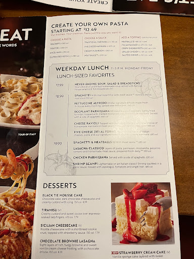 Very expensive for how little food they give you. I got the tour of Italy, but it barely took up about half of the plate, the lasagna was a flat puddle of mush, the garlic bread had a texture that prompted one to think the sawdust they used to make it was very fresh. the portion of chicken was about 4 bites and dry and stringy. Dont ever plan to go back. would have been more satisfied with a family size stoffers lasagna and Texas toast and it would have still been cheaper.