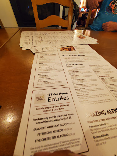 As usual the food was great. This is one of my favorite restaurants however this was the worst service I have ever received at an Olive Garden.. And one of the worst experiences at any restaurant in a long while. Manager noticed the issues and stopped by to offer her apologies and offered to buy our desserts. It was a nice gesture, however when it came time we were told the six of us would only get one dessert as compensation for our very upsetting experience. I ordered two different desserts regardless, only for the waitress to come out later and tell us both of our choices were frozen and that we would need to choose something else. I appreciate the manager trying to rectify the situation but it was one fail after another. Worst waitress I can ever remember... Very disappointing.