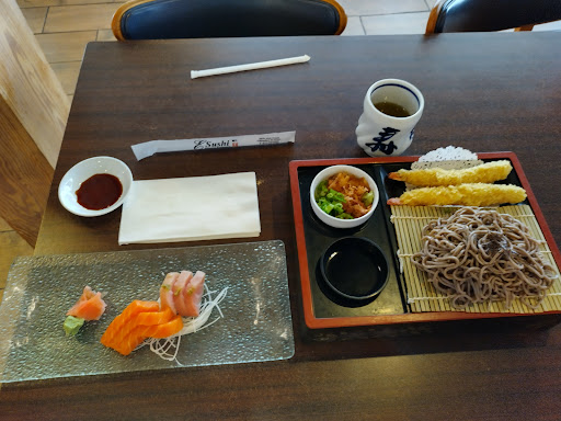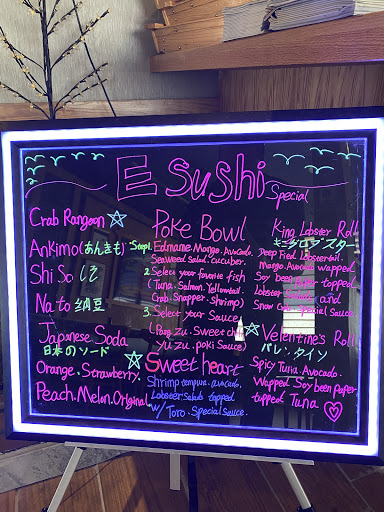 I wanted to bring some take-out sushi lunch to a friend on moving day. I just picked out the E Sushi from online listings and reviews. My friend decided to just meet me there to eat the food, but when we pulled up, we had misgivings as all the windows were covered. However, inside it was cozy and simply decorated, and would have looked bare and cafeteria ish without the window coverings. The sushi couldnt have been fresher and more pleasantly presented. We ordered the sushi lunch plate, with was varied and of sufficient quantity that I was full. The salad starter was an iceberg, cucumber basic salad, but with a big splash of ginger dressing (sauce really, not oily) that really made it tastily refreshing. One could have soup instead of salad. The price was good for the quality and quantity of the food. I cant wait to go back for lunch, or try it for dinner.