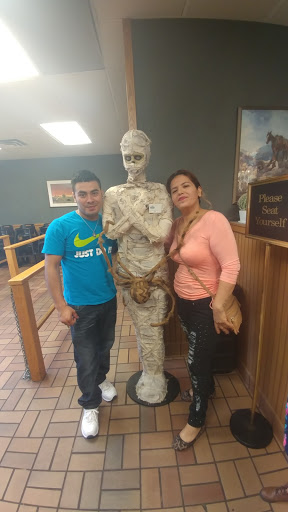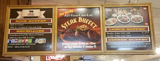 Alright atmosphere. A nice place to go if youre willing to spend $14 +tax times however many people included in your bill is for dinner. Self-seated, a plethora of booths line the walls on the right side. With only 2 small islands to select your food from, half of which is fried, your best bet is with the salad bar or steaks. The salad bar has more options than the 2 islands combined, and the steak area has incredible sauteed mushrooms, and peppers and onions. Besides steak, grilled cheeseburgers and chicken breasts are also two equally fair options. Perhaps the time that which I ate here most recently, it probably being my third time, was just an off day, but the cheesecake tasted off. I suspect it may have been going sour as staff had given no clue as to how long my dessert mainly comprised of cream cheese and eggs had sat out prior to my arrival at the establishment. Seemingly, they are going through bakers, whatever that has to do with how long my cheesecake sat out. The chicken in the kabobs a little dry, and no indication of which steaks are rare, medium, etc.. Despite the flaws in service, a drink is included with your price, that being soda, tea, and much more. The baby back ribs are a must have, quite juicy and not too hot or sweet - just right. The complementary biscuits and homemade butter are great if youre willing to fill up on bread - the butter is great! Despite the poor food selection, what they do have is great, and service is too but any customer service is subject to the waitress/waiter and not the entirety of the staff or establishment. Overall, a great place to eat, but not quite 5 stars. Youd have to blow me away! Other than what Ive listed, no problems, and I would happily eat here again.