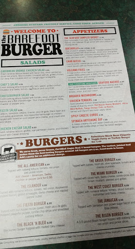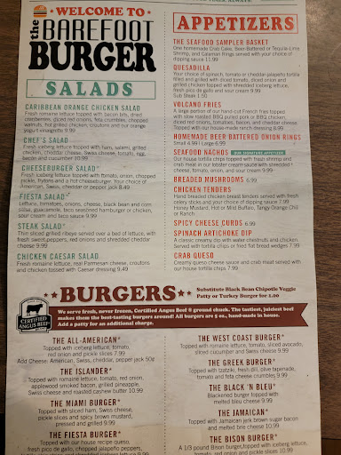 Oh my goodness! We were torn between an Italian place on the square and The Barefoot Burger; around the corner from the square. We looked over the menu, we werent so sure but my son was set on a burger. It didnt help that 3 other small groups were there before us and all we saw was one server. Im so glad we stayed! The angus burgers were delicious and definitely hit the spot! My friend and I had the Black N Bleu burger with bacon and my son built his own bacon burger with pretzel bun. Also just as delicious were the endless fries with queso. However, the Beachcomber Brownie is a "Do Not Miss" to finish the meal off! Drew you were a wonderful server and we had a lovely time.