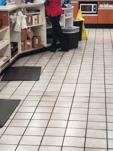 Very small. Only two stalls in womens restroom. Handicap stall has broken toilet seat. No seat cover dispenser. No baby changing station. Kinda dirty - ish. Coffee server was very cheerful and pleasant though. :)