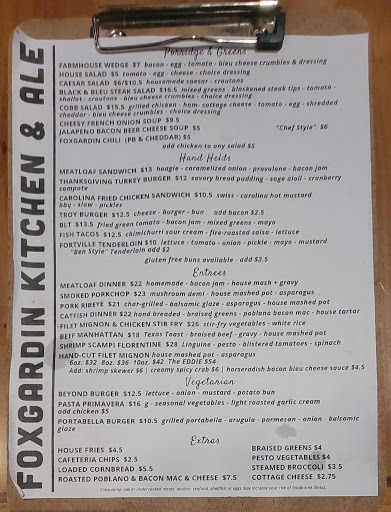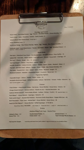 We met some friends here for dinner. We had to make a reservation for a Sat night at a super early 5pm because they were hosting a holiday party. This restaurant is in the small town of Fortville so we were a little skeptical that this was going to be a great place. First impression from the outside is this is going to be a pretty cool modern place. Step inside and it switches to a rustic decor with a lot of bar and not a lot of seating. It turned out to be a good thing that we had our reservation early because by the time we left the place was packed and people at the bar were crowding in on the people at the tables. In regards to the food we tried the Fish Tacos, the chicken dish and the seafood special which was Sea Bass. Everyone was happy with their food and regarding the Seafood special it was very good and an exact dish that I have had at Stone Creek! What are the chances of that?! Sea Bass served on mushroom risotto with a side of steamed broccoli. It was good but not 45 dollar good. Take this with a grain of salt because the dish was about 10 dollars cheaper at Stone creek and its hard to be perfectly happy when you have had the same thing for less money. The Beer and mixed drinks were great but there was something funky with the ice water. We narrowed it down to the ice. Glasses which had cloudy ice tasted bad where the clear ice containing glasses tasted great. The waiter was super cool about it and was able to straighten it out. Unfortunately they couldnt connect with the guys filling up the glasses with the pitchers so after a half glass of good water it got refilled with bad tasting yuck! The last event that split the group was having the manager politely asking us to leave because they didnt leave enough time between reservations. The manager did offer to buy us a round of drinks to leave the table. This upset half of the party while the other half thought it was a nice and considerate offer. All and all the FoxGardin was a good experience and most of the issues are a result of their success. I think well be back but well try to find a night were they are not so busy.