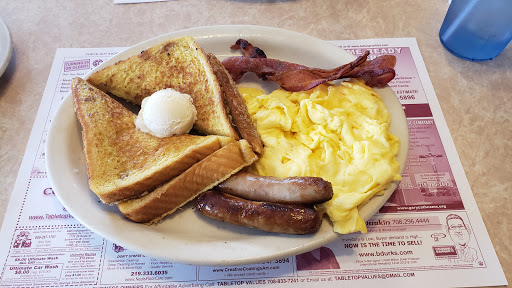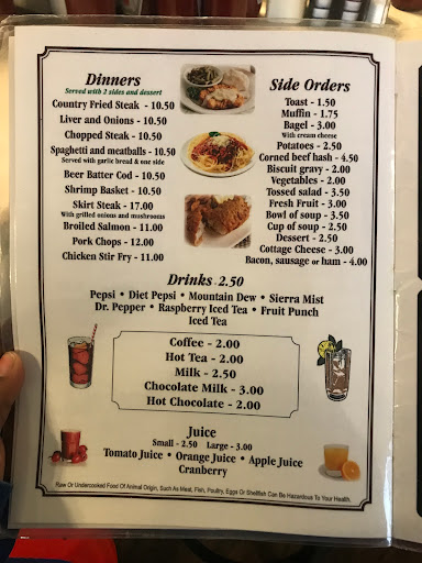 Service warm and welcoming. Food ranks right up there with ihop and round the clock. Value value value great food for the price.