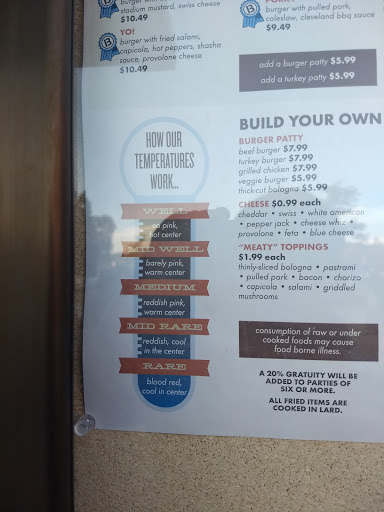 This place is great. I have been reading some of the post on here, and a lot of them sound pretty dramatic. I guess everybody is a food expert. My family and I just love this place. It is never dirty when we go in and the staff are always friendly and prompt. After speaking with several staff while visiting I was informed that they are encouraged to have fun and be upbeat with guest and co-workers. So if you see them smiling, laughing, talking, but doing their job why are people posting on here like its a bad thing? Maybe its just not your type of thing that doesnt mean its a bad thing at all. You cant please every single person, but from what I see on the regular is that they are hustling doing their jobs everytime we go in. Somebody is always running, cleaning tables, stocking pickle bar, wiping down, and sweeping. The cooks are always moving in the back ( open kitchen ) not one person is perfect. Maybe your burger was a little under maybe there was a new person in the back, maybe you didnt really know what the temp was. Does a mid-well burger contain pink in it? The answer is of course YES it does. I asked how many oz come in a order of fries, I was told 8oz wow half a pound and people are saying they are small??? 4 dollars. A large fry at mcds is 3.49 there are nowhere near as many. The quality of food isnt very good either. My fries are always packed full, 14oz of onion rings to an order, 6oz burgers, brisket, sirloin, and chuck. Grass fed cattle finished on corn, no antibiotics or hormones ever in any of their protiens. Turkey half white half dark meat this will cause a pink tint to the burger btw and unless you order a gobbler the other turkey burgers are byo so you have to add toppings, lto no charge only if you add a premium topping. Also I read an angry review because the person said they close at 11....No they dont they close at 10:30 Fri/Sat. The last review I would like to comment on is the person who said that their child got sick later in the evening after dinner at bspot seeming to be food poisioning. Did you take your child to the hospital is it a fact? Ore you just guessing? Even if you were a doctor you wouldnt be able to tell unless test were done. Nobody else got sick? I asked if they ever had any issues with food poisioning. I was told no. There were 2 complaints in the 2 years they had been open, but both ended up being stomach flu. I was also told by the server that there were zero violations in their last health inspection just a couple months ago. My family and I eat here all the time as do our friends and co-workers. We all love this place. The food is great. The service is great. I would bring and recommend anybody I know to try this place. Thanks,